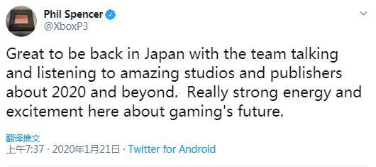 在推文中,Phil Spencer如此写道:“非常高兴可以与团队从头来到日本,并与工作室和开发商进行沟通,听取他们2020年及未来的开展趋势。关于游戏的未来,这儿充满着热情与生机。”