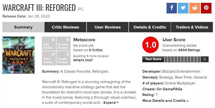 闻名游戏评分网站 metacritic 显现,《魔兽争霸Ⅲ重制版》现在已跌至 1 分。