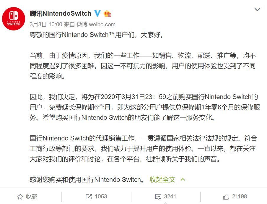 3月3日,国行NS的官方微博账号发布了一条消息,宣布在3月31日前购买的国行NS,均可免费延长保修期6个月。
