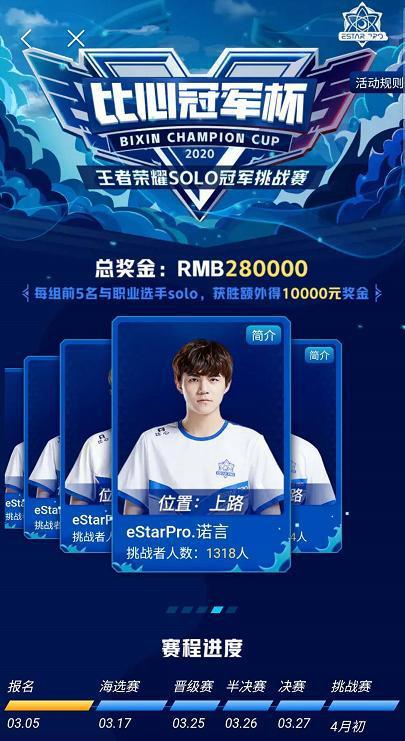 此次应战赛也将分为五个赛道,每个赛道则坐拥着一名eStarPro队员。玩家也能够在报名页面挑选应战的选手,然后填写一些相关的信息完结报名。路程分为海选赛、晋级赛、半决赛、决赛等多轮对决!相同的,比心冠军杯王者荣耀应战赛也是设立了较为丰盛的阶梯奖赏:终究决出的每组1-3名分获3000、2000、1000元奖金,每组的前5名玩家将取得与eStarPro冠军选手solo的资历。假如玩家在solo赛中取胜,将额定取得1万元奖金。