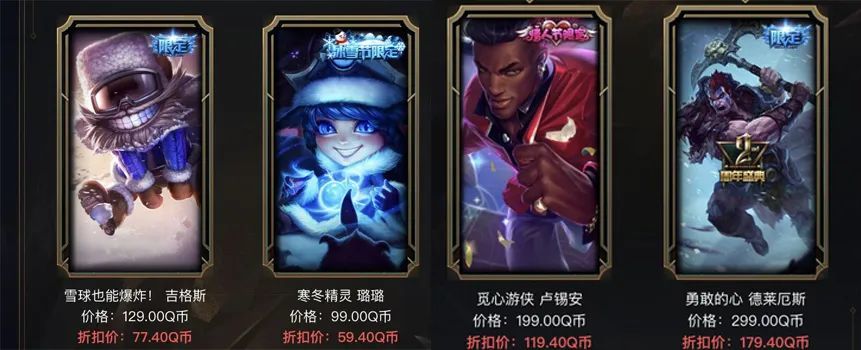 限制方面,大都以情人节皮肤,万圣节皮肤,冰雪节皮肤,冠军皮肤以及二周年德莱厄斯为主,限制方面问的比较多的有以下那么几款(抱愧我不能逐个回复各位,音讯实在太多了,所以我只能做一份一致的回复)