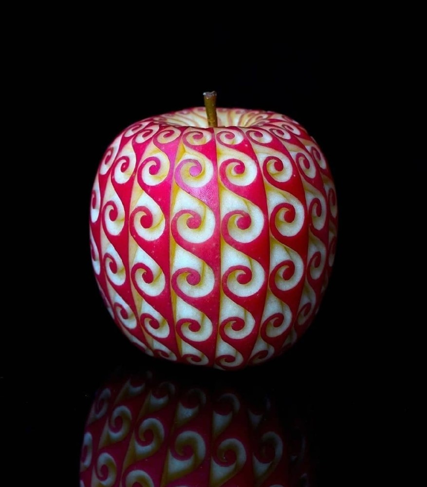 首先是用苹果雕琢成的恶魔果实,雕琢大神先将苹果竖向分为十六等分,然后在每等分上雕琢出恶魔果实的纹理。说起来简略,可是在雕琢过程中的确需求花费很多的精力和时刻,最重要的是每一刀的力道要把控妥当,否则图画就很简略不匀称,并且下刀的深浅也有考究。想要在苹果上雕花并不算难,可是要雕琢出一个完美的恶魔果实却也没那么简略,自认为雕工好的海贼迷们也能够雕一个应战一下哦。