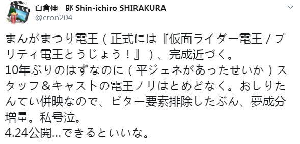 将于4月24日在东映漫画节活动中放送的假面骑士电王剧场版:美丽电王,近来作为首要制造人的白仓宣布了对这部剧场版的简谈,自称自己被感动到了。