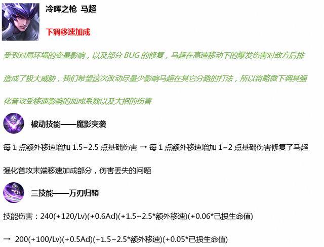 马超自从上线以来就一向在被调整,一开始我们玩不明白的时分觉得马超不强,后来才发现马超关于后排的要挟是其他英豪都比不了的。一个发育起来的马超一般只需求两枪就能够秒掉一个脆皮,损伤实在是有点可怕。而这次的体会服傍边从被迫和大招两个视点下降了马超的损伤。不过马超在高手手里边必定仍是能玩起来的,进场率不会遭到太大影响。