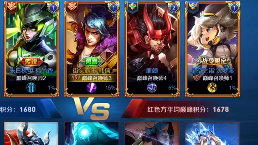 这一把他们这边可以说是梦境阵型了,在加载界面的时分就可以正常的看到队友五个人有三个是巅峰赛榜首的标志,还有一个第二最差的关羽,也是一个第七,这真的便是国服最强巅峰赛对局了,这一个账号是寂然的一个小号他的英豪胜率不怎么样,韩信也仅仅玩了200多场,只要50%的胜率,最夸大的一点便是没有一个金牌银牌。