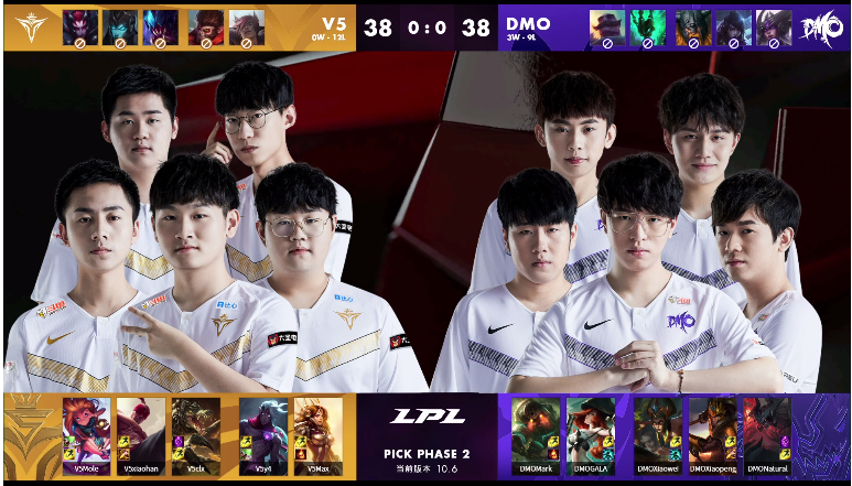两边BO3第一局开端,蓝色方V5,赤色方DMO。