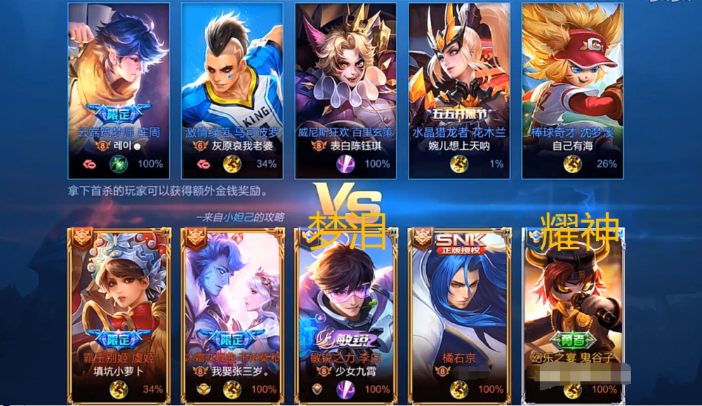 在一局竞赛中,梦泪和耀神一同组队开黑,这局游戏梦泪拿出了李白,他运用的是ID为“少女九天”的账号,这个号应该是梦嫂的。耀神自己也是国服李白,但他一向十分尊重梦泪,所以这局游戏毫不勉强拿出鬼谷子,走辅佐方位。值得一提的是,跟他们一同打游戏的,还有AG超玩会的其他选手。